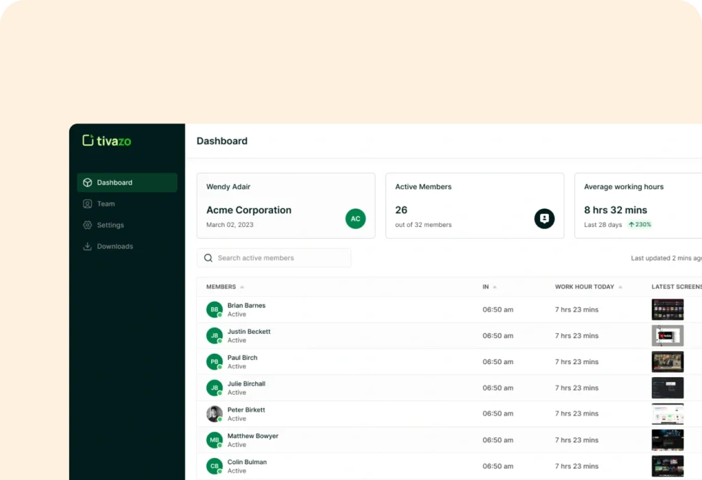 Tivazo is designed for both in-office and remote teams, offering features like activity tracking, screenshots, and productivity analysis to manage your team from anywhere.